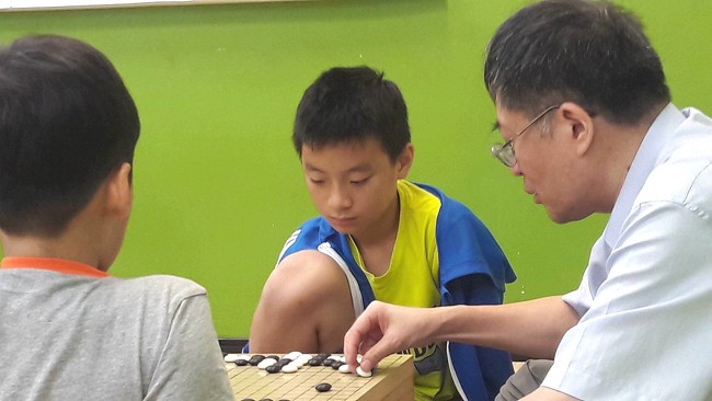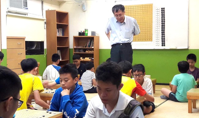 下課了,陳永安老師仍要將這一盤棋檢討完。藍衣者蔡孟勳7段。