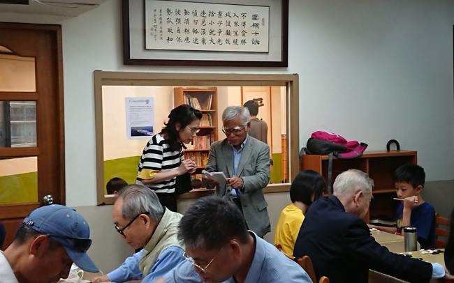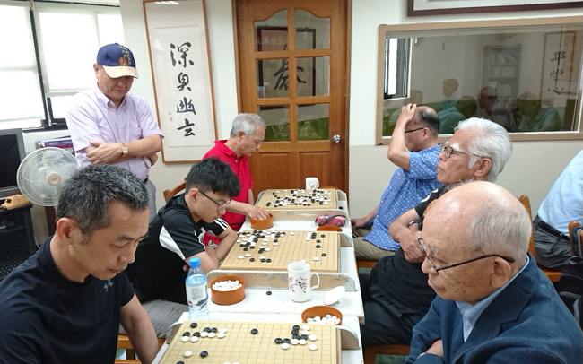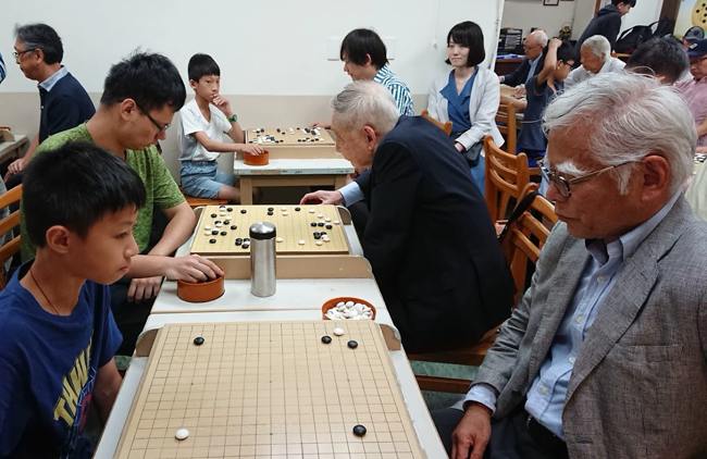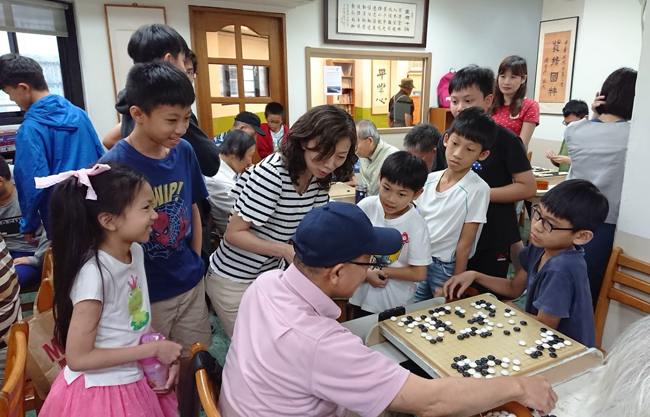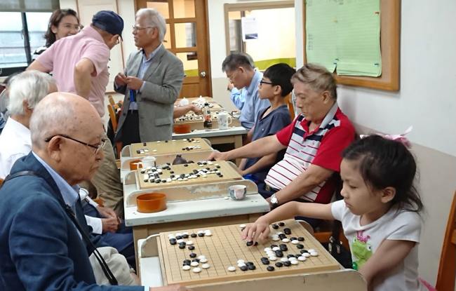 爺爺們實力堅強,棋院都是5、6段以上小朋友接招。學員黃禹瀚媽媽(左三)以流利的日語擔任翻譯。