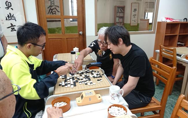兩天交流中,山下老師展現十足生命活力,他以80餘歲(資深老者)帶領著60歲(初老老人),不止下棋,還認真局後檢討,對棋的熱愛可見一般。