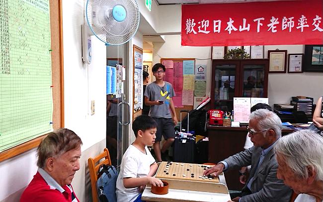 精氣神十足的山下老師參觀棋院教學活動後,展開對奕。第一天是與學員們的「爺孫配」之交流活動。爺爺們實力堅強,棋院都是5、6段以上小朋友接招。